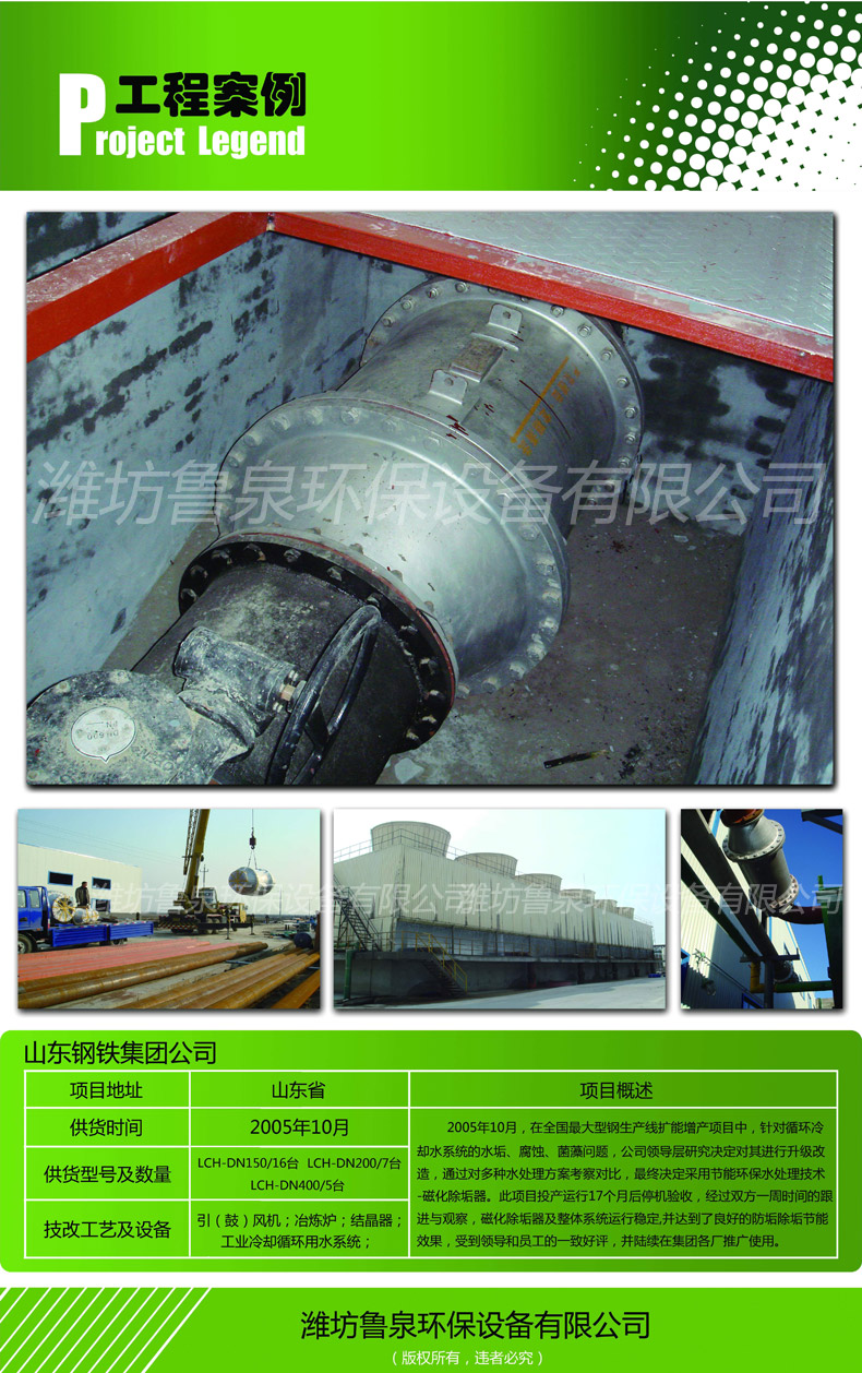 2005年10月,在世界最大型鋼生產(chǎn)線擴(kuò)能增產(chǎn)項(xiàng)目中,針對循環(huán)冷卻水系統(tǒng)的水垢、腐蝕、菌藻問題,公司領(lǐng)導(dǎo)層研究決定對其進(jìn)行升級改造,通過對多種水處理方案分析對比,最終決定采用節(jié)能環(huán)保防垢除垢技術(shù)-磁化除垢器。此項(xiàng)目投產(chǎn)運(yùn)行17個(gè)月后停產(chǎn)驗(yàn)收,雙方通過一周時(shí)間的跟進(jìn)與觀察,磁化除垢器及整體系統(tǒng)穩(wěn)定運(yùn)行,并達(dá)到了良好的除垢節(jié)能效果,受到領(lǐng)導(dǎo)和員工的一致好評,并陸續(xù)在集團(tuán)各廠推廣使用。
