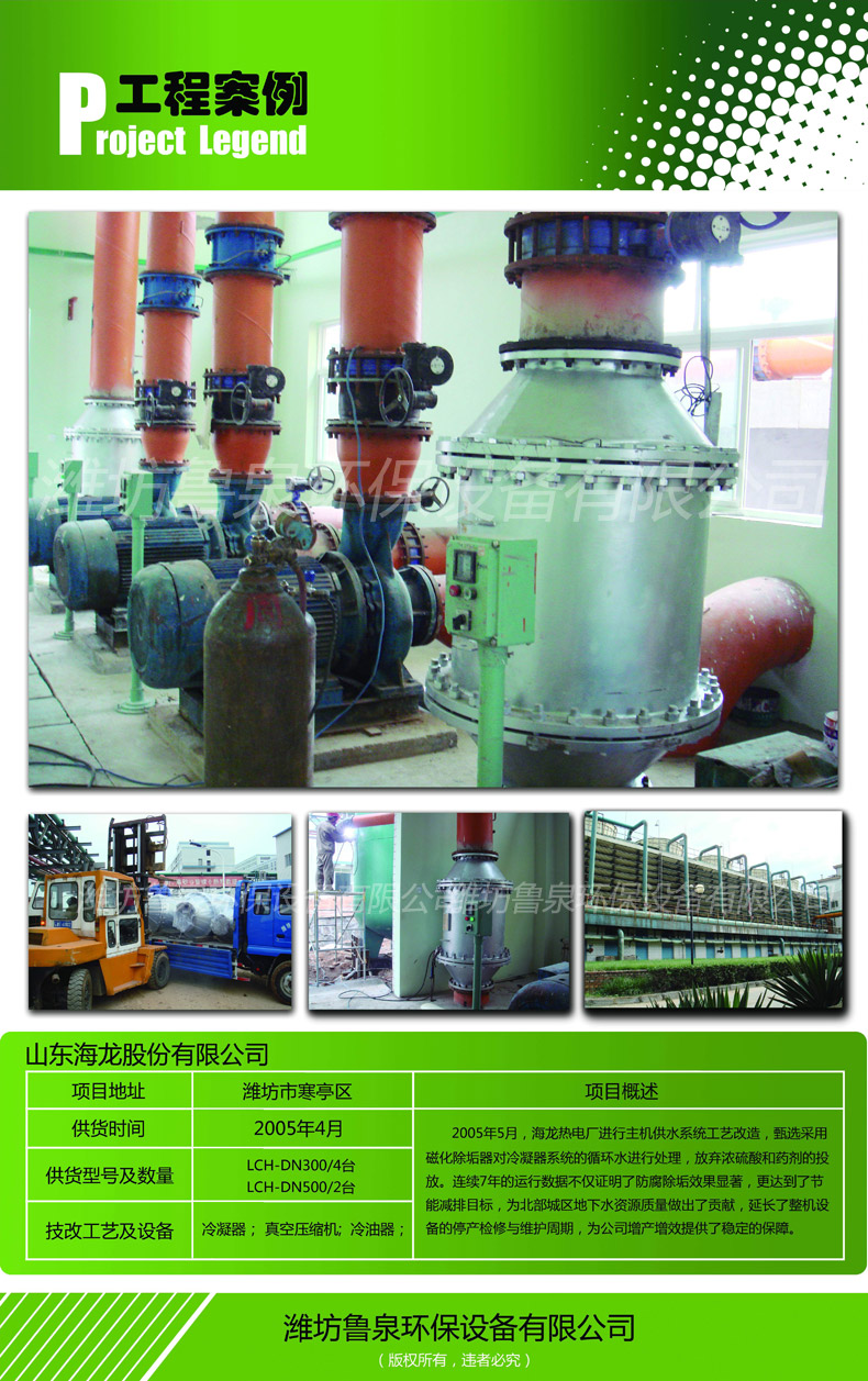 2005年5月,海龍熱電廠進(jìn)行主機(jī)供水系統(tǒng)工藝改造,甄選采用磁化除垢器對(duì)冷凝器系統(tǒng)的循環(huán)水進(jìn)行處理,放棄濃硫酸和藥劑的投放。連續(xù)7年的運(yùn)行數(shù)據(jù)不僅證明了防腐除垢目的實(shí)現(xiàn),更達(dá)到了節(jié)能減排目標(biāo),為北部城區(qū)地下水資源質(zhì)量做出了貢獻(xiàn),延長(zhǎng)了整機(jī)設(shè)備的停產(chǎn)檢修與維護(hù),讓公司增產(chǎn)增效提供了穩(wěn)定的保障。