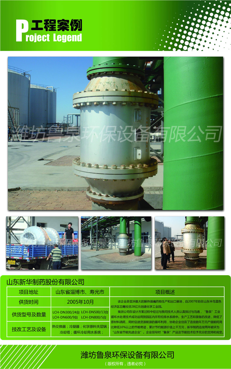 集團公司在設計方案過程中經(jīng)過與我司技術人員認真探討與溝通,“魯泉”工業(yè)循環(huán)水處理技術成功運用到園區(qū)內(nèi)所有給排水系統(tǒng)中。生產(chǎn)工藝和裝備的 改進,降低了原材料消耗,同時促進資源能源的循環(huán)利用。協(xié)助企業(yè)創(chuàng)造了連續(xù)數(shù)年萬元產(chǎn)值能耗同比降低10%以上的節(jié)能奇跡,累計節(jié)約能源價值上千萬元,新 華制藥連續(xù)兩年被評為“山東省節(jié)能先進企業(yè)”。企業(yè)領導對“魯泉”產(chǎn)品及節(jié)能技術給予充分的支持和肯定。