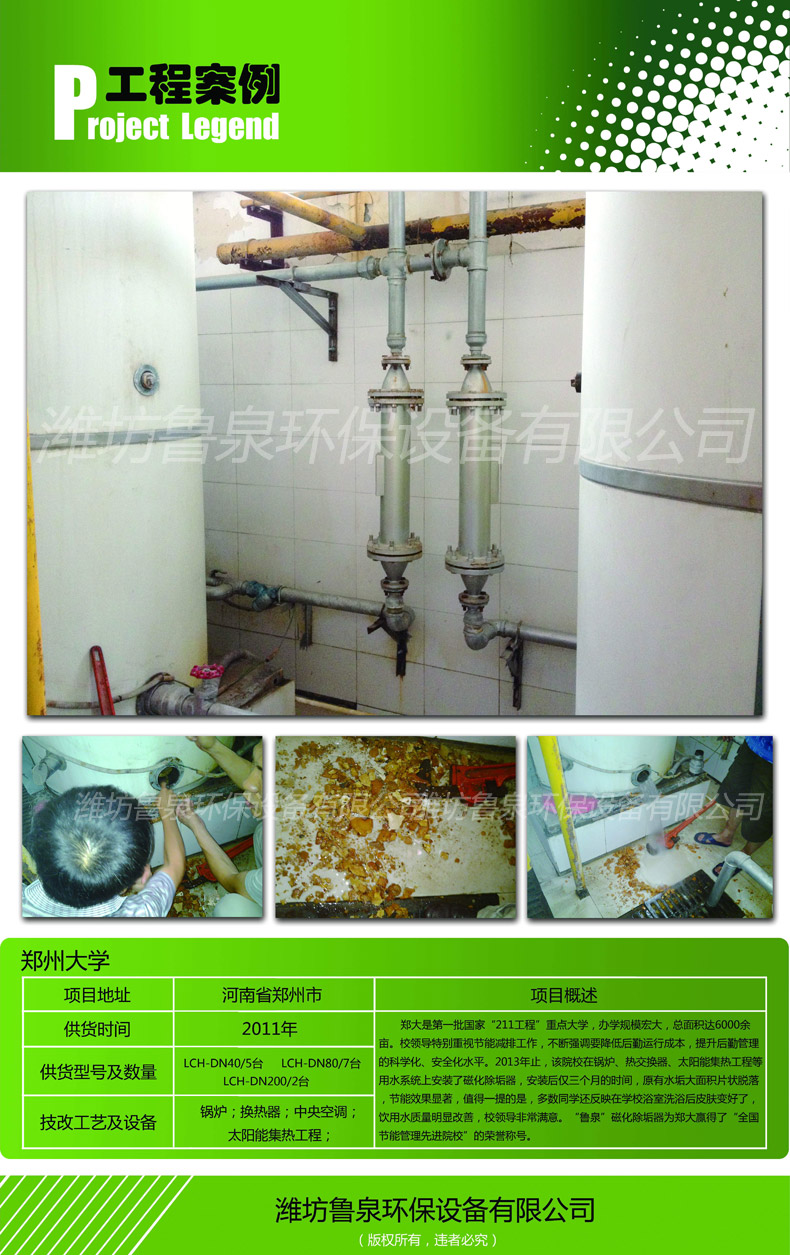 鄭大是批國(guó)家“211工程”重點(diǎn)大學(xué),辦學(xué)規(guī)模宏大,總面積達(dá)6000余畝。別榮海副校長(zhǎng)特別重視節(jié)能減排工作,不斷強(qiáng)調(diào)要降低后勤運(yùn)行成本,提升后勤管理的科學(xué)化、安全化水平。2012年末,該院校在鍋爐、熱交換器、太陽(yáng)能集熱工程等用水系統(tǒng)上安裝了磁化除垢器,安裝后僅三個(gè)月的時(shí)間,原有水垢大面積片狀脫落,節(jié)能效果顯著,值得一提的是,多數(shù)同學(xué)還反映在學(xué)校浴室洗澡后皮膚變好了,飲用水質(zhì)量明顯提高。校領(lǐng)導(dǎo)非常滿意,“魯泉”磁化除垢器為鄭大贏得了“全國(guó)節(jié)能管理先進(jìn)院校”的榮譽(yù)稱號(hào)。
